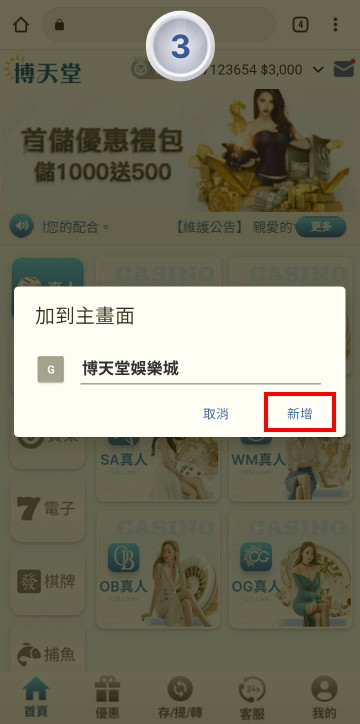 將博天堂官網'新增置主螢幕'
